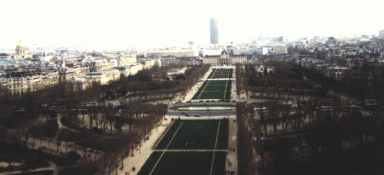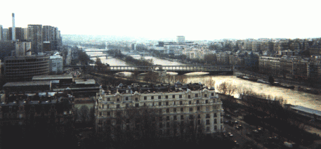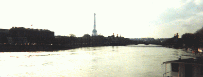As I walked, I could see the Eiffel tower get closer and closer. Soon enough, I was under the largest flagpole in the world (at 300 metres, the Eiffel tower was built in 1889 as a centrepiece to the World's Fair). After running into a Stanford undergrad, I climbed up the stairs to the second floor and took a picture from all sides---I consider the view of the Palais de Chaillot to be the best, though the views from other three sides were pretty cool as well, particularly the ones of the Seine: . On my way up to the third floor, standing in a long line, I met an ex-Stanford graduate student and we had a long conversation which involved tossing around lateral thinking questions to each other. We stayed through sunset to see Paris at night, which was a beautiful sight but unfortunately my dinky camera didn't capture it.