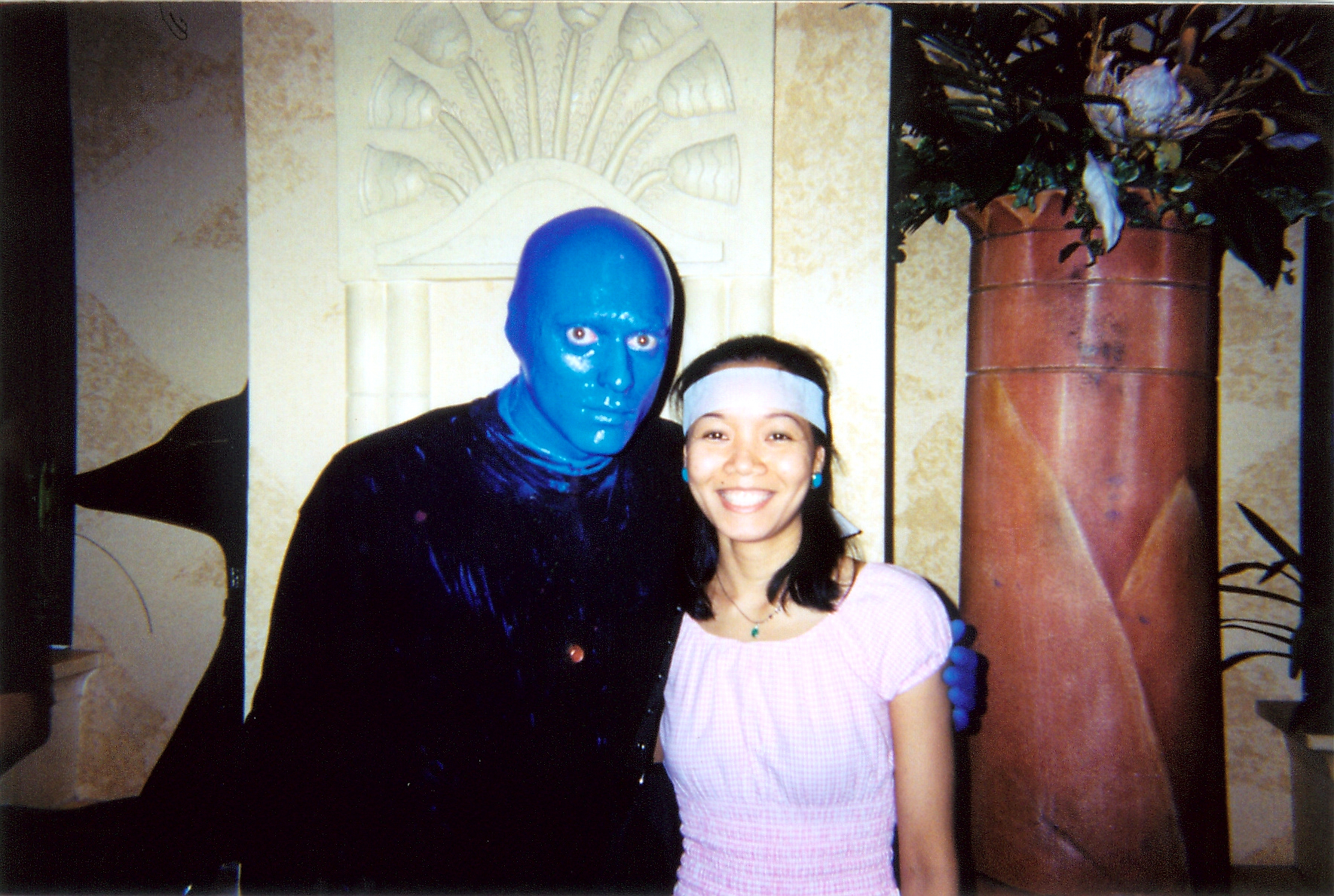 The psychedelic show features several short episodes or "vignettes", where the anonymous Blue Men engage in crazy "out of this world" antics, sometimes with the audience participating. One of them involves a Blue Man catching balls of some malleable substance in his mouth until it is completely full, and then regurgitating all of it out into a statue. Another simply involves the use of a clapper-operated light to create mayhem as the audience releases that their clapping has as much influence as the Blue Men's.